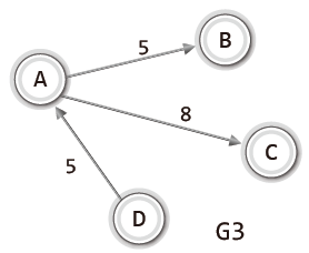 그래프 G3의 간선 집합 E(G3) = {<A, B>, <A, C>, <D, A>}